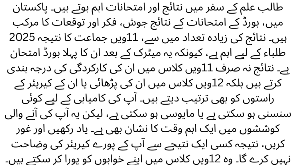 The result of 11 class 2025 is an important occasion for students from all corners of Pakistan. There may be a thrill for your achievement or there may be disappointment, but it also marks an important time in your upcoming endeavors. Remember and consider, the result will not define your whole career by any single result.They can reach their dreams in 12th class and thereafter, with dedication, guidance, and effort. Furthermore, it is on parents, teachers, and society to support them, instead of creating pressure, in order for students to move forward with assurance. The essence of education lies not just in marks, but marks are only the means to learn, develop, and positively contribute to society.