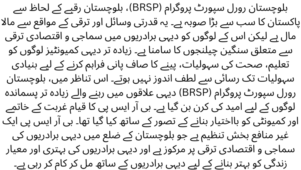 Balochistan Rural Support Programme (BRSP) ,Balochistan is the largest province of Pakistan in terms of area. It is endowed with natural resources and opportunities for development but its peoples face serious challenges related to socio-economic development in rural communities. Most rural communities do not enjoy the access to basic facilities to provide the people education, health facilities, clean drinking water to earn their livelihoods. In this context, the Balochistan Rural Support Programme (BRSP) has become a ray of hope for most disadvantaged people living in rural communities. BRSP was established with the notion of poverty alleviation and community empowerment. BRSP is a not-for-profit organization which is focused on the socio-economic development of rural communities in Balochistan district and has been working in collaboration with rural communities for the betterment of rural communities and improved quality of life.
