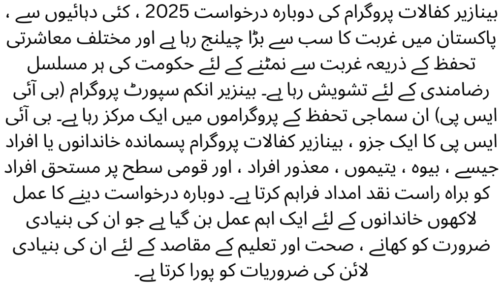 Benazir Kafalat Program Re-Application 2025,For many decades, poverty has been one of the greatest challenges in Pakistan and has been a concern for each successive government willingness to tackle poverty through various social protection. The Benazir Income Support Programme (BISP) has been a centerpiece among these social protection programs. The Benazir Kafalat Program, a component of the BISP, provides direct cash assistance to marginalized families or individuals such as, widows, orphans, persons with disabilities, and deserving women nationally.The re-application process has now become a significant process for millions of families relying upon this financial assistance to meet their baseline needs for food, health and education purposes.