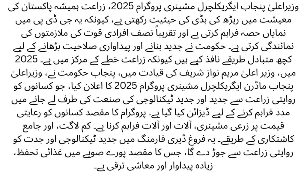 CM Punjab Agricultural Machinery Program 2025,Agriculture has always been the backbone of Pakistan’s economy, as it provides a significant share of GDP and represents around half of the workforce’s jobs. The government has implemented some alternative ways to modernize and increase productivity as agriculture is at the heart of the region. In 2025, the Punjab government, under Chief Minister Maryam Nawaz Sharif, announced the CM Punjab Modern Agricultural Machinery Program 2025, designed to aid farmers in the move from traditional agriculture, to a modernized and innovative technology industry.The program intends to provide farmers with agricultural machinery, equipment and tools at discount or subsidized prices, to assist transitioning to climate-friendly, low-cost, and inclusive farming practices. This promotion will link modern technology and innovation in dairy farming to traditional agriculture, all aimed at food security, greater produce, and economic development across the province.