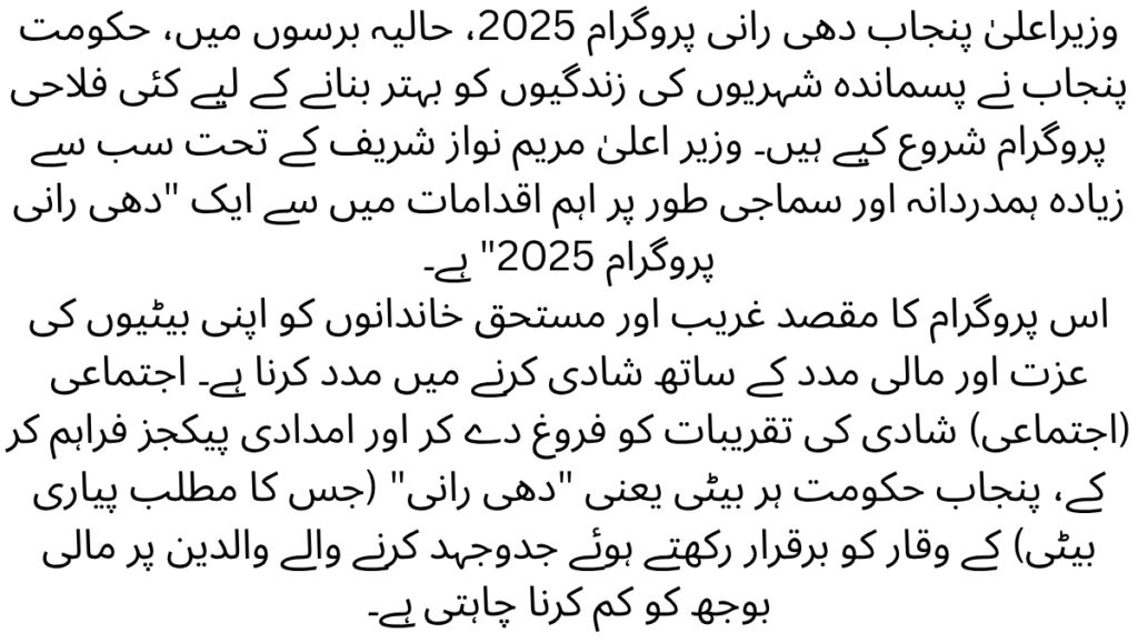 This program aims to help poor and deserving families marry off their daughters with honor and financial support. By promoting collective (mass) marriage ceremonies and providing assistance packages, the Punjab Government seeks to reduce the financial burden on struggling parents while upholding the dignity of every daughter — the “Dhee Rani” (meaning beloved daughter).