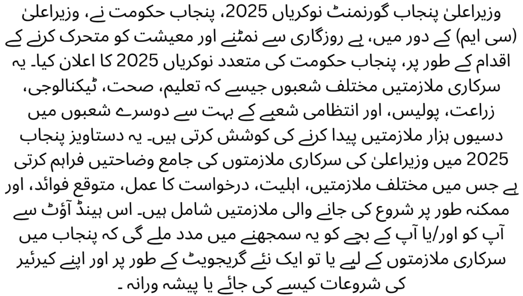 The CM Punjab Government Jobs 2026 scheme is an important initiative to provide solutions to unemployment, create productive youth, and aid an efficient system of governance in Punjab. This will create one thousand employability opportunities in all sectors of employability, education, health, technology, police, and administration. This initiative assures the inhabitants of Punjab a bright future ahead.By adhering to principles of merit, transparency, and equality of opportunity, the CM’s vision ensures that all capable citizens across all districts will contribute to moving Punjab forward. Regardless if you are a student, graduate, or experienced profession, 2026 is the year to begin your working career with the Punjab Government and contribute to the overall future direction of the province.