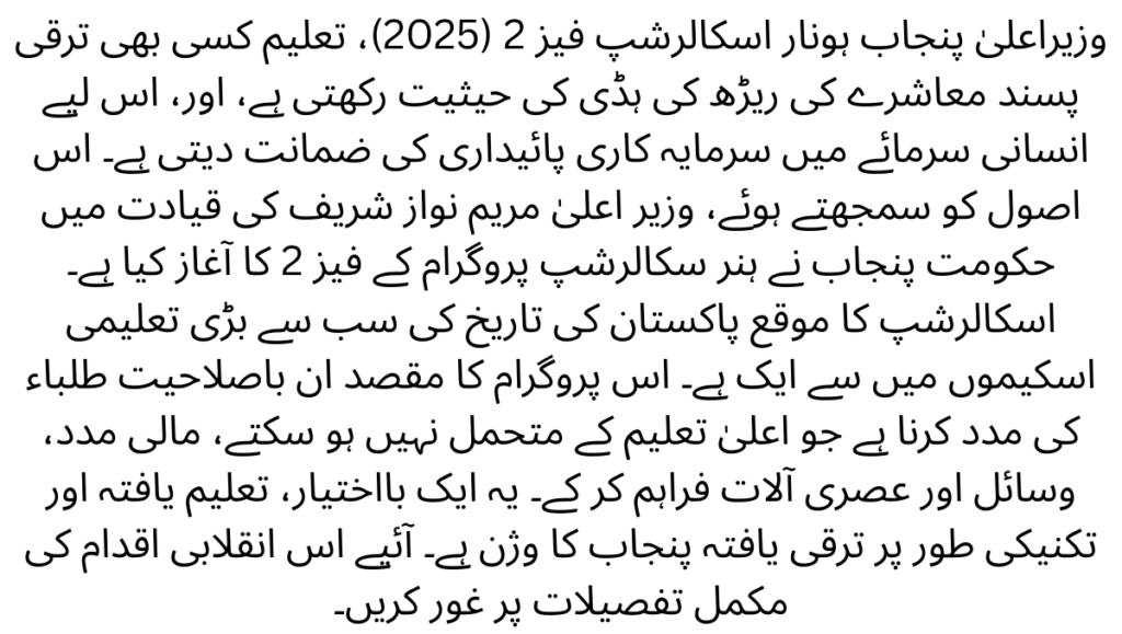 CM Punjab Honhaar Scholorships Phase 2 (2025),Education is the spine of any progressive society, and, hence, investing in human capital guarantees sustainability. Comprehending this principle, the Government of Punjab, under Chief Minister Maryam Nawaz Sharif, has launched Phase 2 of the Honhaar Scholarship Programme. The scholarship opportunity is arguably one of the biggest educational schemes in the history of Pakistan. This program aims to help talented students who can’t afford higher education, by providing financial support, resources, and contemporary tools.Honhaar Scholorship Phase 2 is not just a scholarship program; it is a vision for an empowered, educated, and technologically advanced Punjab. Let us skim through the complete details of this revolutionary move.