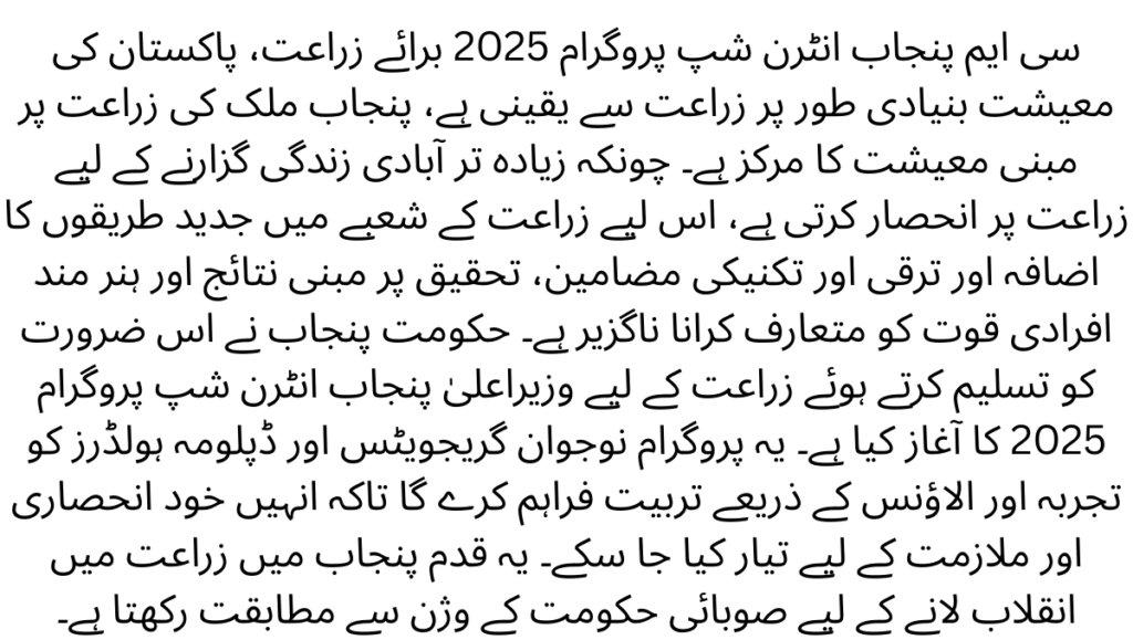 CM Punjab Internship Program 2025 for Agriculture,The economy of Pakistan is primarily assured from agriculture, with Punjab being the heart of the country’s agriculture-based economy. As most of the population relies on agriculture for a living, it is imperative to add and develop modern methods of farming and introduce technical disciplines, research-oriented conclusions and skilled manpower in the agriculture sector. The Government of Punjab has initiated the CM Punjab Internship Program 2025 for agriculture in recognition of this necessity. This program will provide young graduates and diploma holders with training through experience and allowance to make them self-reliant and job-ready.This step aligns with the provincial government’s vision to revolutionize agriculture in Punjab through the energy and knowledge of qualified young professionals.
