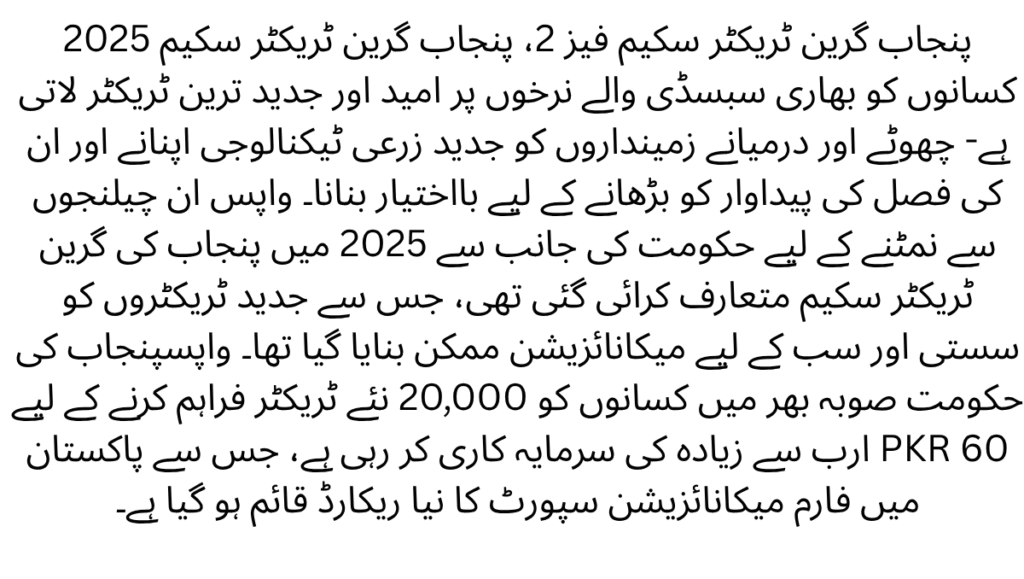The Punjab Green Tractor Scheme – Phase 2 is a government initiative aimed at providing subsidized tractors to farmers in Punjab. It offers up to PKR 500,000 subsidy for 50–65 HP tractors and PKR 1,000,000 subsidy for 75 HP and above tractors to promote modern farming and boost agricultural productivity.